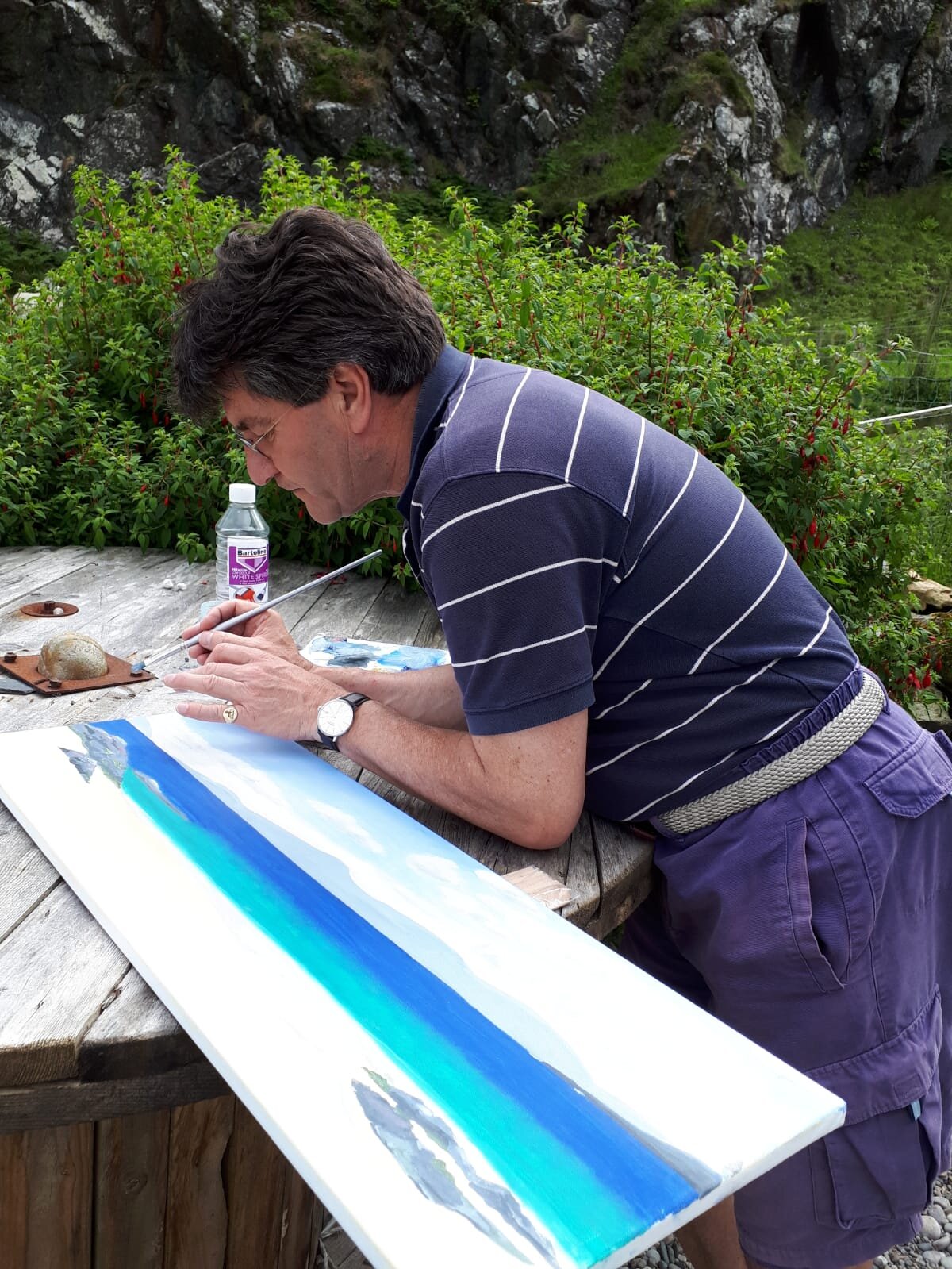 While still experimenting and developing his technique, David loves landscape, seascape and colour, the texture of oil paint and the immediacy of water colour. He is delighted to receive commissions and has recently completed an African wildlife landscape, portraits and abstract paintings for clients.